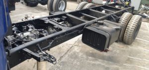 Khung gầm xe được sản xuất từ thép hợp kim nguyên khối, trải qua quy trình xử lý nhiệt tiên tiến giúp tăng độ cứng vững và khả năng chịu tải vượt trội. Toàn bộ khung gầm được sơn nhúng tĩnh điện để chống ăn mòn và kéo dài tuổi thọ sử dụng. Chassis thiết kế phẳng, được gia cố hai lớp thép tại các điểm chịu lực lớn, cho phép xe vận hành ổn định ngay cả khi chở quá tải đến 16–17 tấn, đáp ứng nhu cầu vận chuyển nặng của doanh nghiệp.
